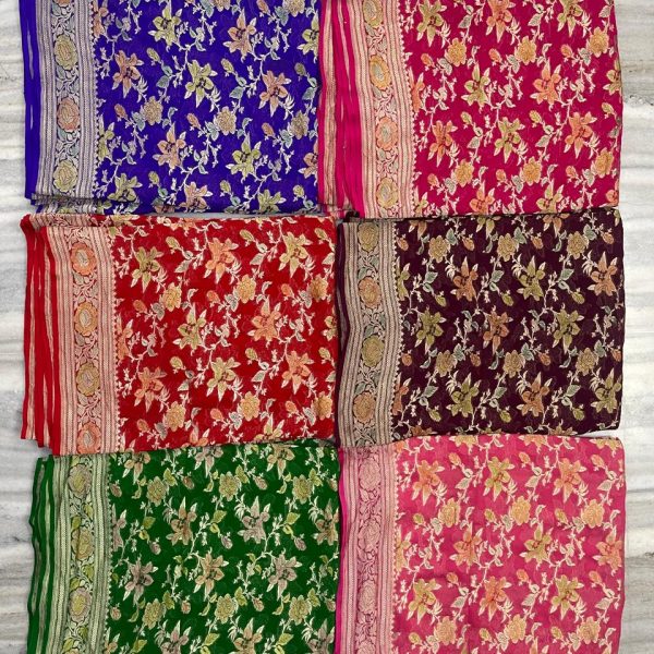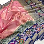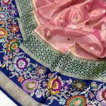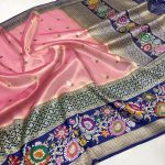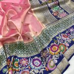 Crafted on pure handloom Kora Tissue, the body glows with a luxurious sheen, paired beautifully with a dual-colour Kadhyal Katan Silk Tilfi Minakari border.