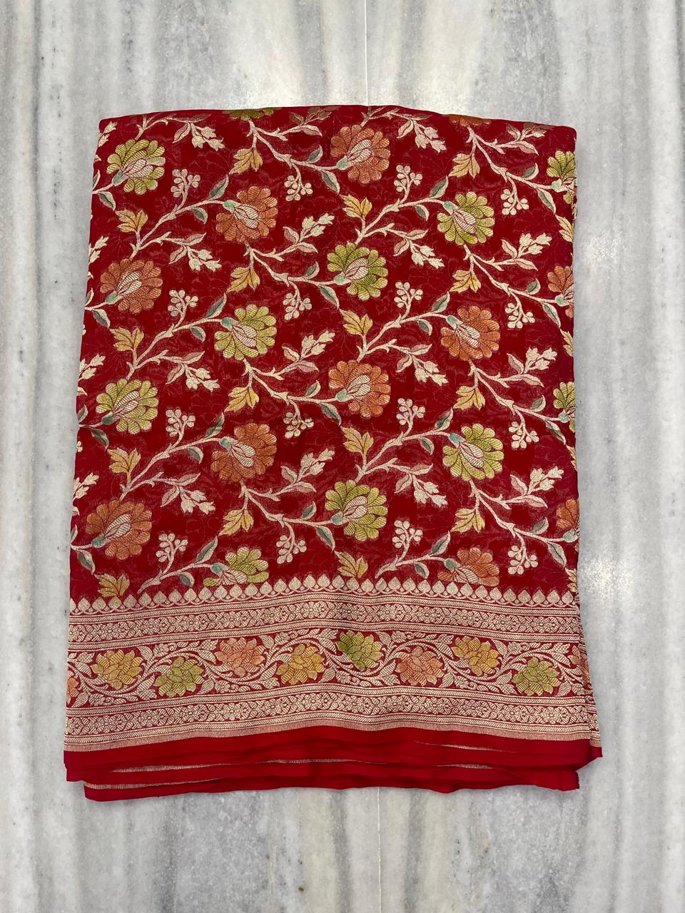 it offers a soft, lightweight texture that drapes effortlessly on any body type. The vibrant red hue and elegant design make it perfect for weddings, festive occasions, or evening gatherings. Each saree is handwoven, giving it a unique character with subtle variations in color and weave