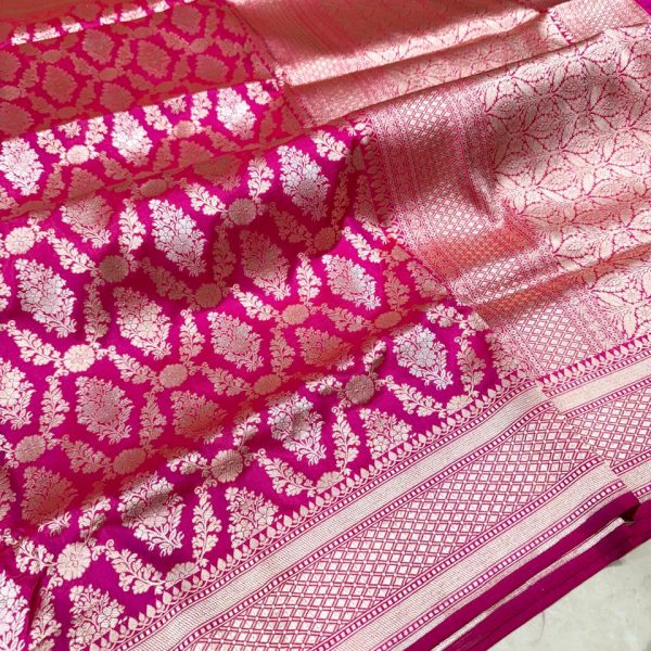 Elevate your elegance with the Vintage Handwoven Banarasi Pure Silk Saree. Crafted from luxurious 100% Pure Katan Silk using the traditional Kadwa technique, this saree showcases exquisite Banarasi craftsmanship. The vibrant Barbie pink shade adds timeless vibrancy, perfect for special occasions and festive celebrations. Experience rich heritage and unmatched softness, making every drape a graceful expression of style.